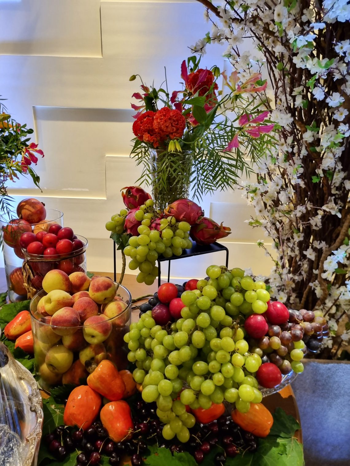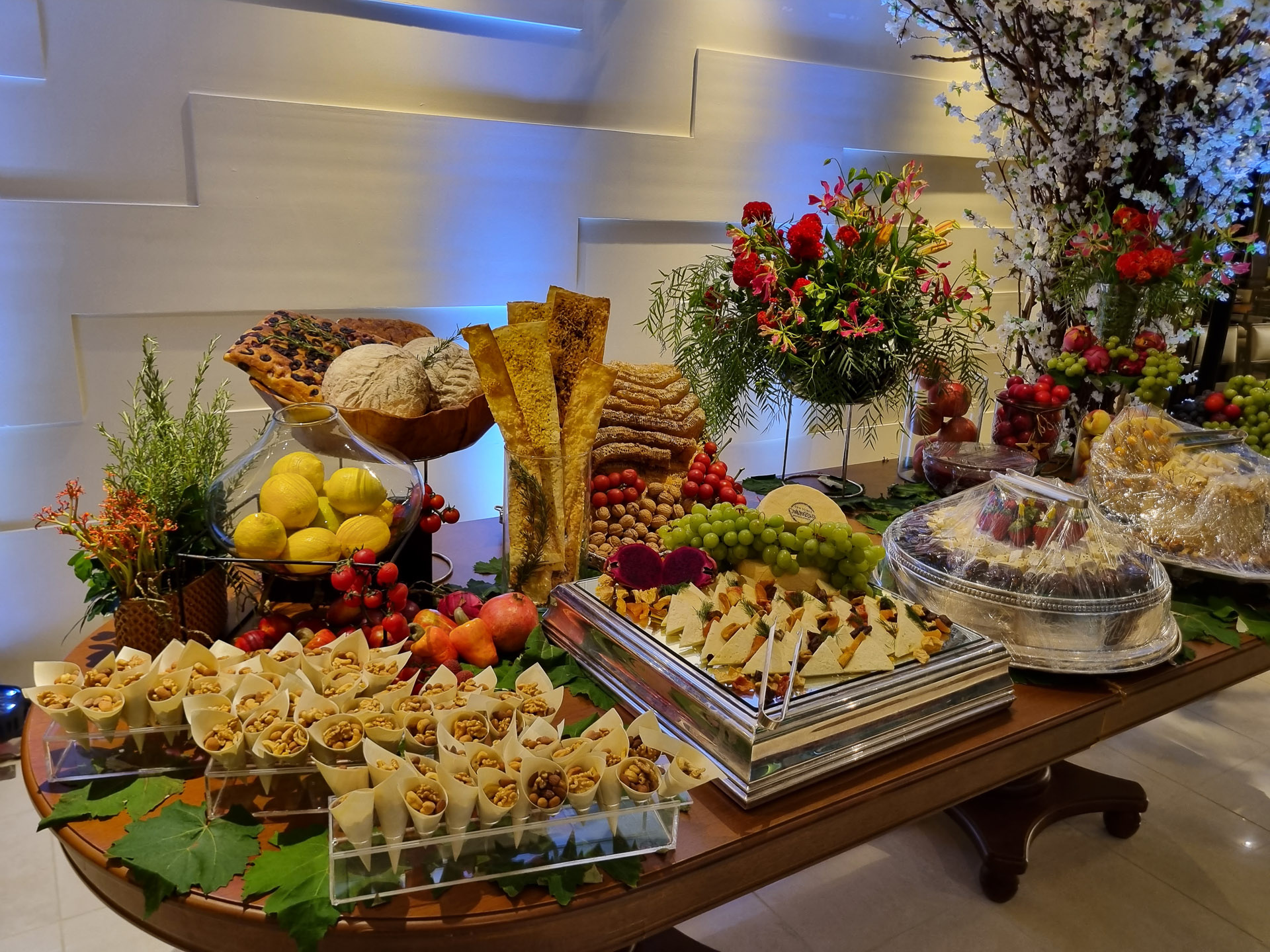 Entre as entradas, estão seleção de queijos com geleias e chutneys, tender com uvas ao espumante, brochettes especiais, coalhada seca com azeite e zatar, figos recheados, salada de rúcula baby com carpaccio de salmão, frutas frescas e opções variadas de finger foods.